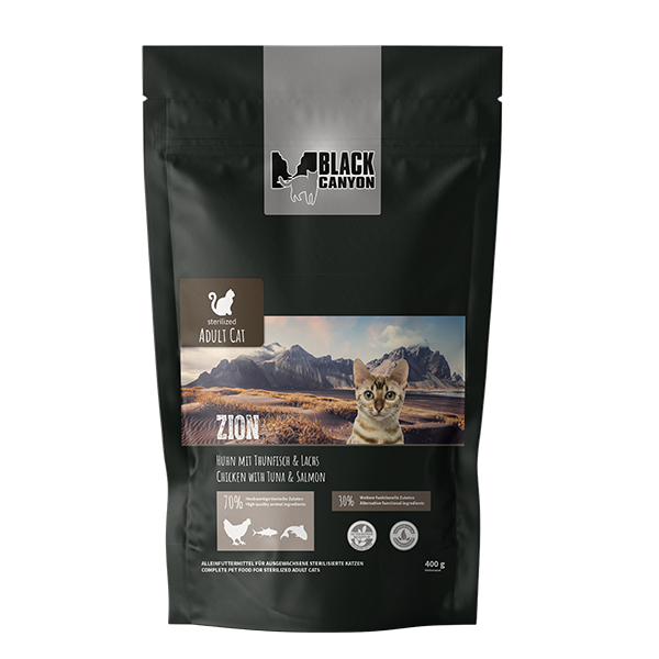 BLACK CANYON ZION - Huhn mit Thunfisch & Lachs IST genau richtig für sterilisierte, kastrierte und/oder übergewichtige Katzen. Frisches, mageres Hühnerfleisch zusammen mit frischem Thunfisch und Lachs sind wichtige Bausteine für straffe Muskeln und beste Fitness. Der reduzierte Fettgehalt hilft deiner Katze dabei, ihr Gewicht zu halten, während der hohe Proteingehalt eine gesunde Muskulatur unterstützt. Thunfisch und Lachs sind ausgezeichnete Quellen für essenzielle Omega-3-Fettsäuren, die entzündungshemmende Eigenschaften haben und die Gesundheit von Haut, Fell und Gelenken unterstützen. Auch für ältere Katzen ist BLACK CANYON ZION bestens geeignet.