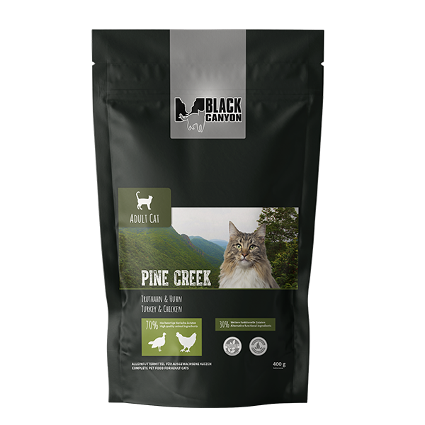 BLACK CANYON PINE CREEK - Truthahn und Huhn Trockenfutter besteht zu 70% aus hochwertigen tierischen Zutaten, mit all ihren Nährstoffen, die deine Katze braucht. Frischer Truthahn und mageres Hühnerfleisch sind zwei hochwertige Proteinquellen, die eine straffe Muskulatur und eine gesunde Verdauung fördern. Beide Fleischsorten sind reich an essenziellen Aminosäuren, die deine Katze optimal versorgen und ihre Gesundheit im Gleichgewicht halten. Zellulose unterstützt die Reduzierung von Haarballen, während Probiotika die Nährstoffaufnahme unterstützen. Das frische Truthahnfleisch gibt BLACK CANYON PINE CREEK einen Geschmack, den Ihre Katze lieben wird!